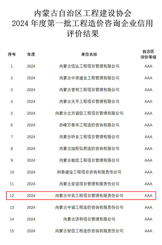 2024-07-3017366 次近期,我公司参加内蒙古自治区工程建设协会组织的“2024年度第一批工程造价咨询企业信用”申报,获得“信用AAA级证书”。我公司成立多年以来,遵循中国工程造价管理协会对造价咨询企…